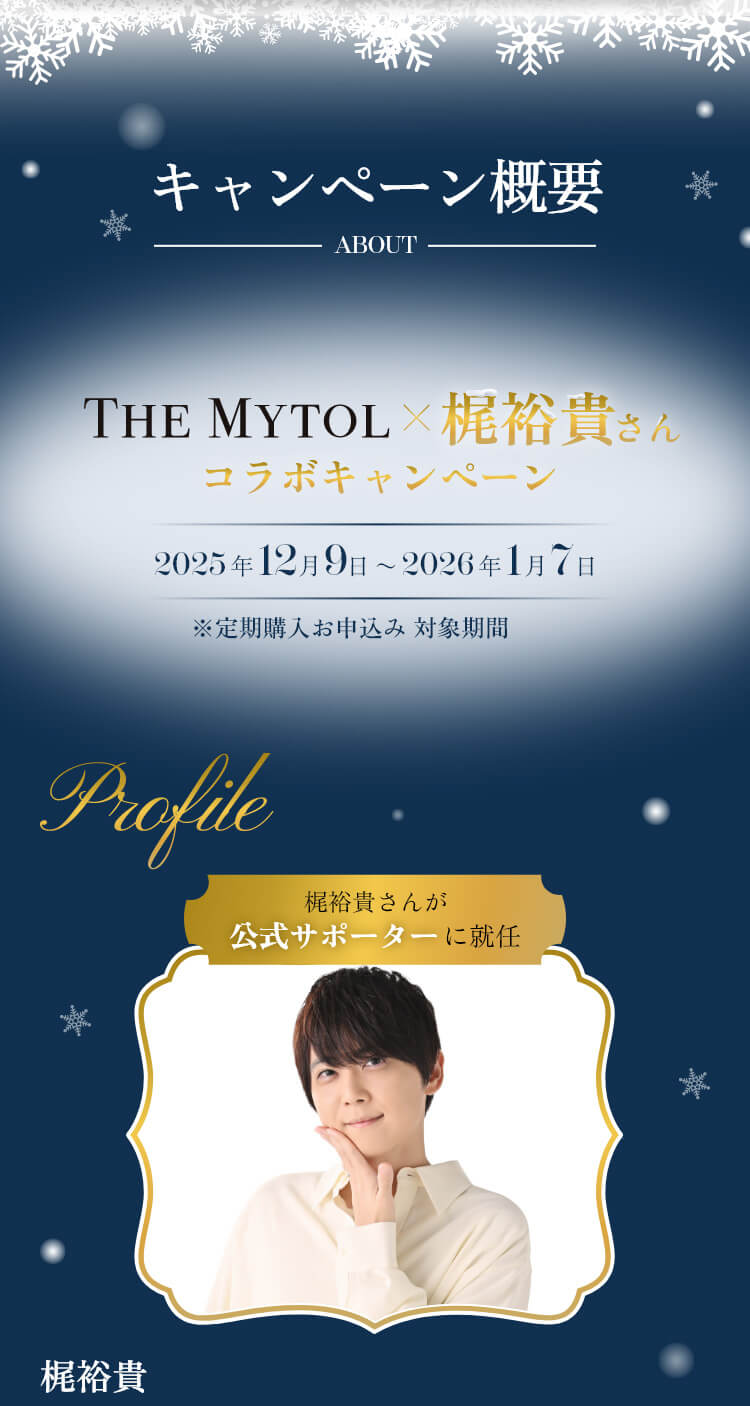 ※本キャンペーンの特設サイトからTHE MYTOL ESSENCEの定期購入を開始いただいた時点で、本規約に同意したものとみなします。●キャンペーン期間(定期購入開始 対象期間)