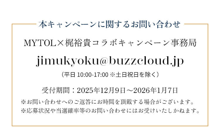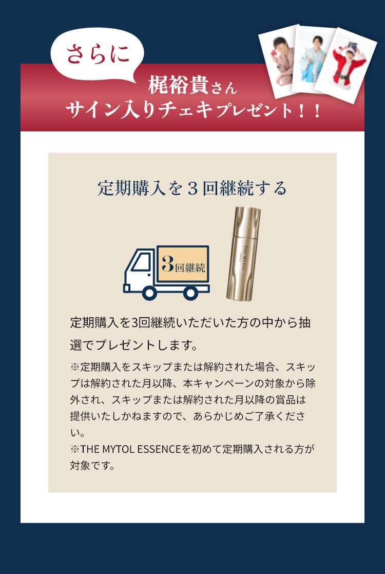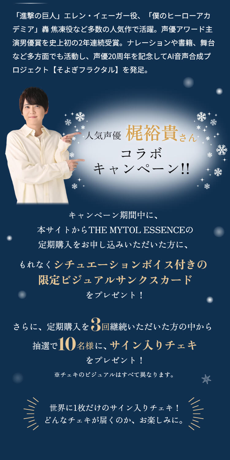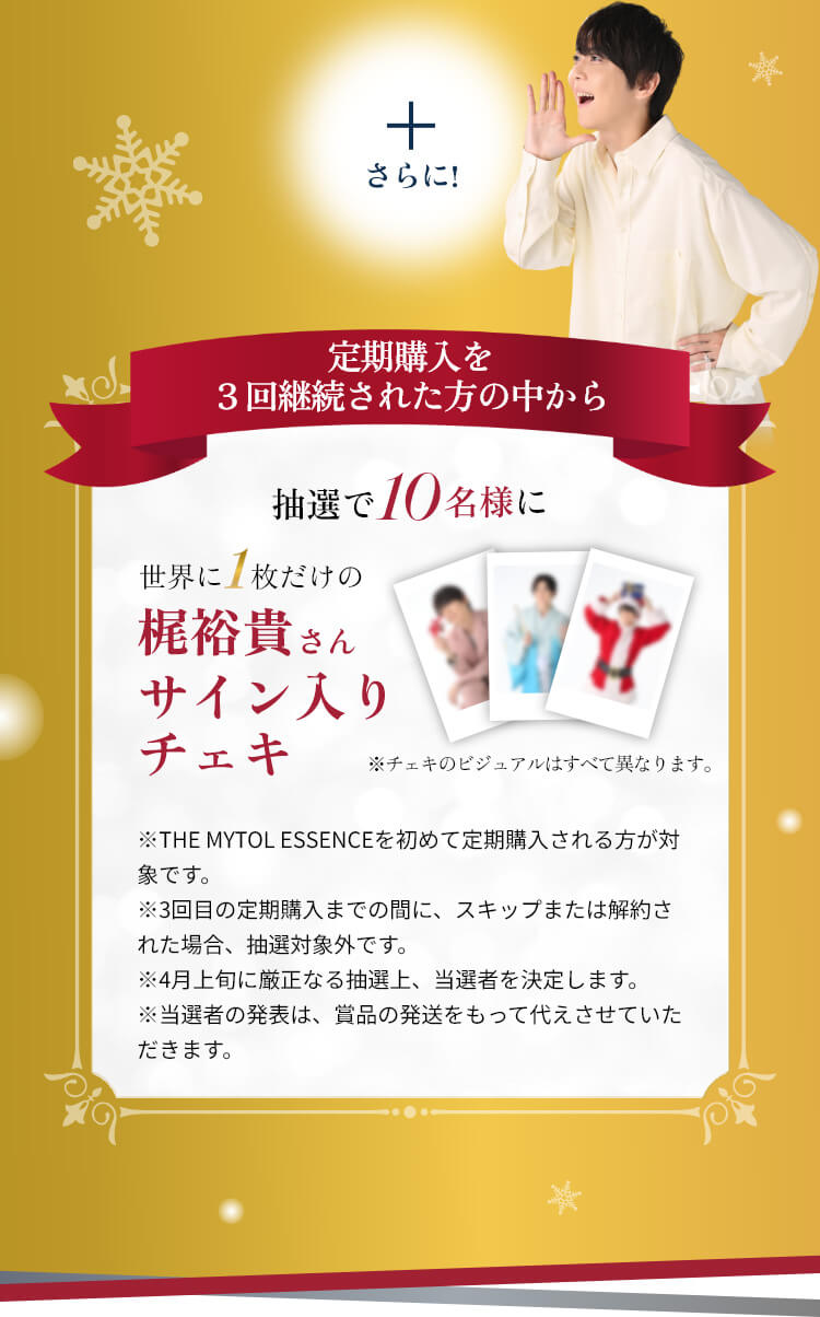 THE MYTOL ESSENCEを初めて定期購入される方で、本キャンペーン期間中に、本キャンペーンの特設サイトからTHE MYTOL ESSENCEの定期購入を開始いただき、定期購入を3回継続いただいた方の中から、抽選で10名様に、梶裕貴さんのサイン入り限定チェキをプレゼントするキャンペーンです。