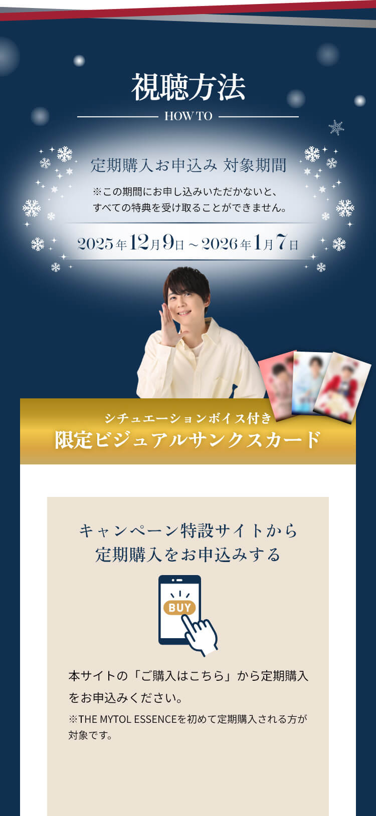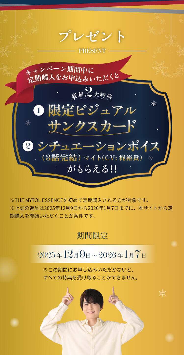 THE MYTOL ESSENCEを初めて定期購入される方で、本キャンペーン期間中に、本キャンペーンの特設サイトからTHE MYTOL ESSENCEの定期購入を開始いただくと、もれなく梶裕貴さんのシチュエーションボイス付きの限定ビジュアルサンクスカードがもらえるキャンペーンです。なお、定期2回目、3回目までそれぞれ続けていただくと、月ごとに異なるデザインの限定シチュエーションボイス付きのサンクスカードがもらえます。●賞品詳細