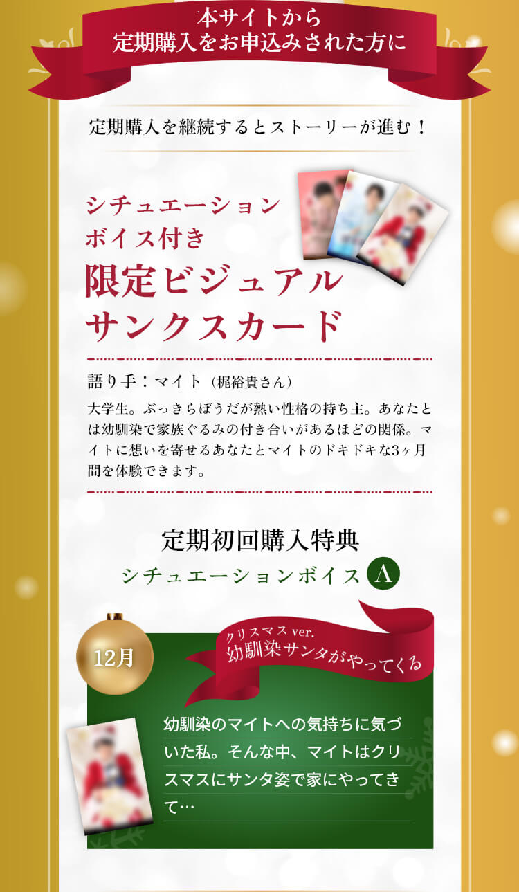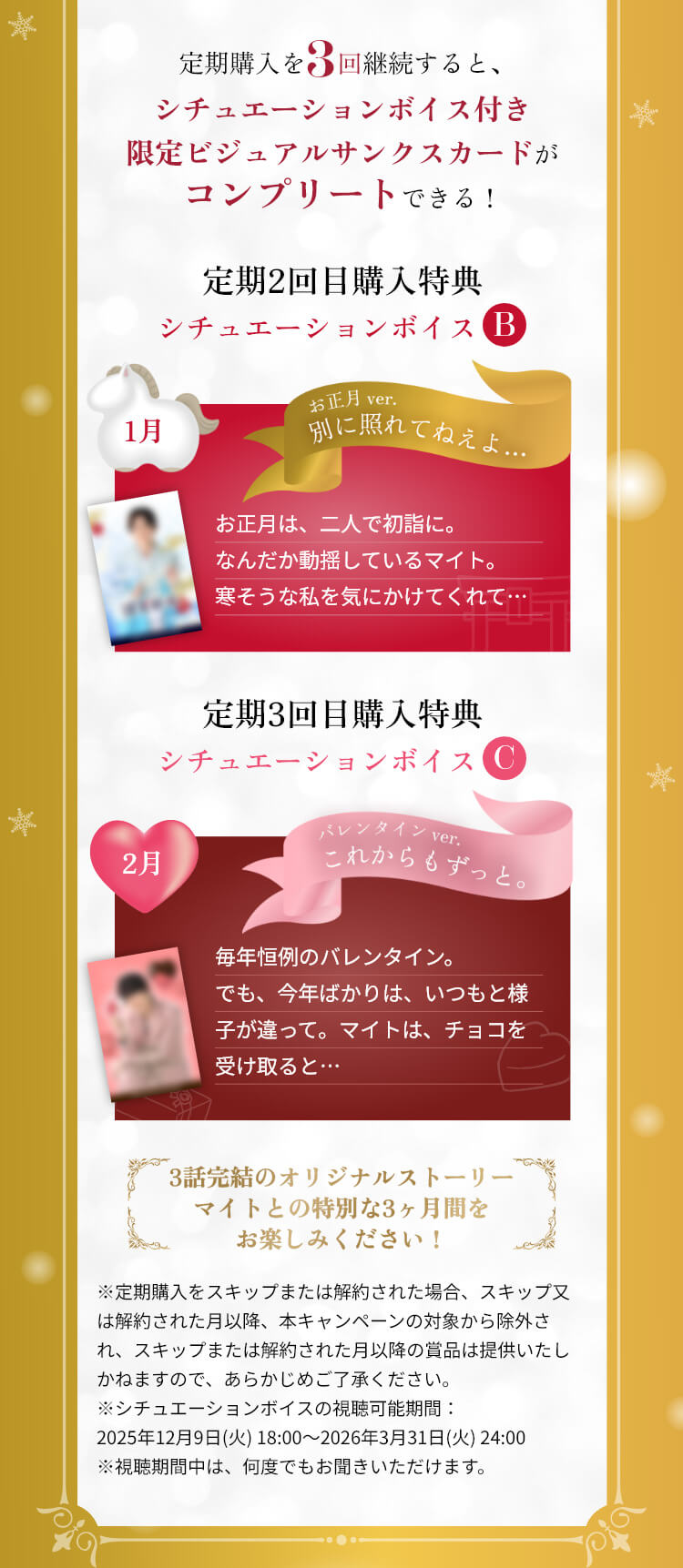 ※各カードのシチュエーションボイスの再生可能期間は2025年12月9日(火) 18:00~2026年3月31日(火)24:00です。●キャンペーン期間(定期購入開始 対象期間)